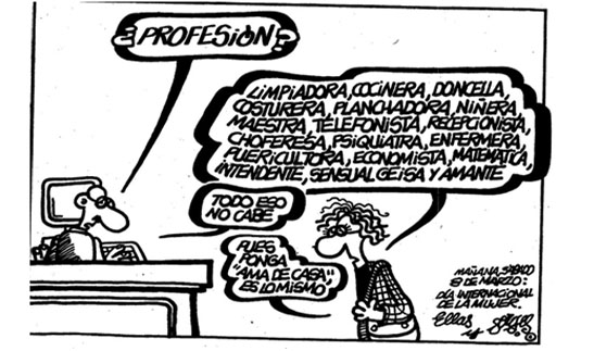 En esta viñeta, Forges consigue ilustrar con una imagen y pocas palabras una grande y compleja realidad. Aprovechamos la ocasión para hacerle un pequeño homenaje y agradecerle que en su trabajo reivindicara el papel de la mujer en el mundo laboral, al mismo tiempo que visibilizaba el “otro” trabajo, ese que no se ve: el del cuidado, el de las labores domésticas, el de madre…