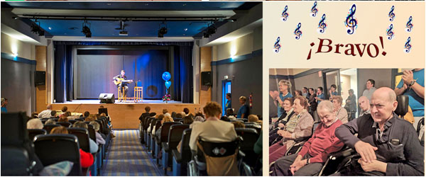 Y por fin llegó el momento tan esperando, con un salón de actos abarrotado de residentes, Hijas de la Caridad, Voluntarios, miembros de la Junta y personal laboral comenzó el concierto. Se creó un ambiente íntimo donde la presencia del Señor se hizo presente en los corazones de todos los que allí estuvimos. Y comenzó Luis con su voz y su guitarra a acariciar a cada uno de los que allí nos encontrábamos.